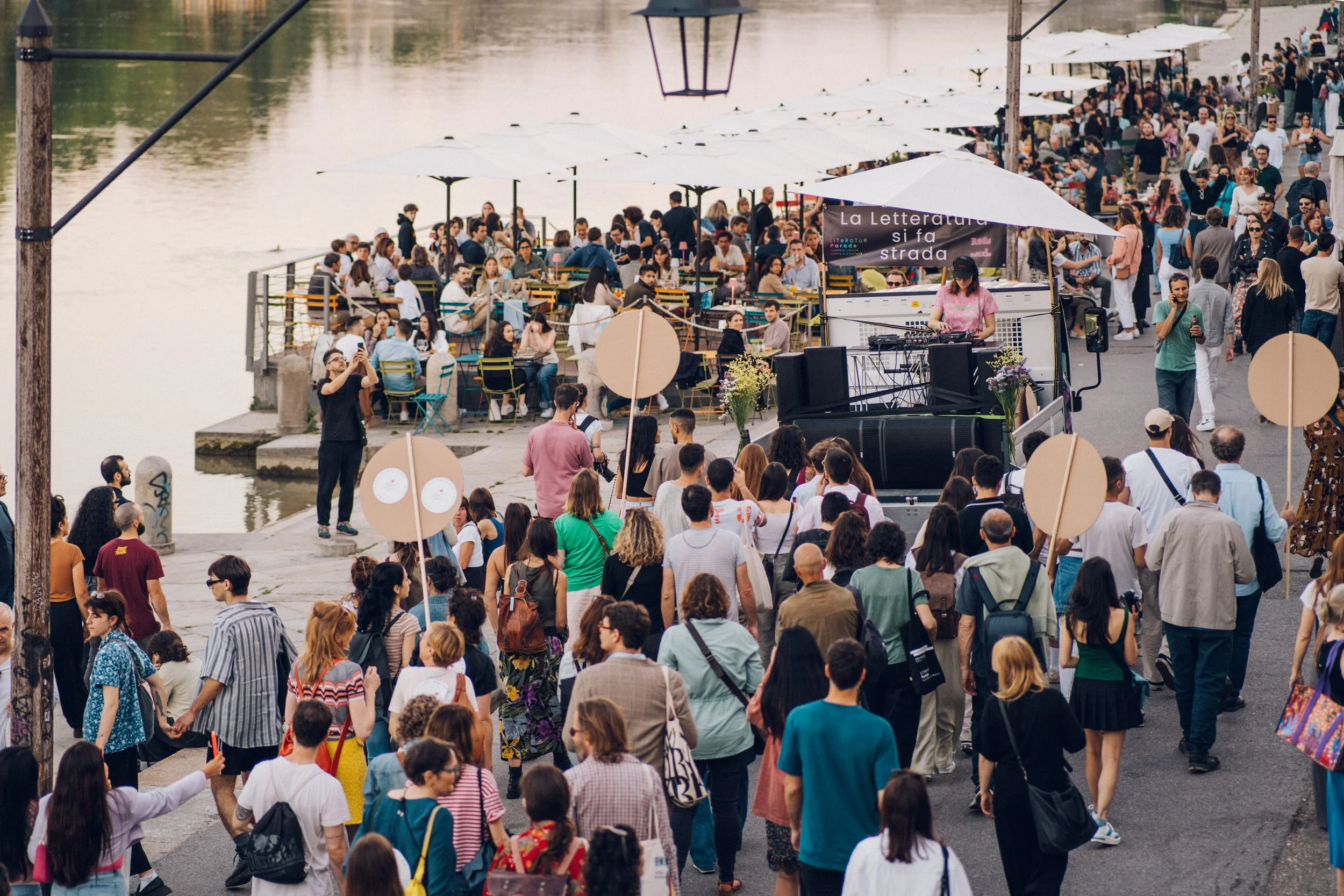 DIE READ PARADE, die erste Love Parade für Literatur, ist eine Initiative, die ich im Jahr 2019 entwickelt und am 09. Mai in Berlin erstmals durchgeführt habe. Unterstützt durch die Frankfurter Buchmesse und das italienische Kulturmagazin LUCY SULLA CULTURA haben wir während des Salone del Librio a Torino, der Turiner Buchmesse, mit über tausend Zuschauerinnen und Zuschauern die READ PARADE erneut gefeiert. Eine Feier der Power des Lesens und eine Demonstration für mehr Literatur im öffentlichen Raum. Gegen das Buchhandelssterben und dem Zurückdrängen der Bücher aus dem sichtbaren öffentlichen Raum, geht die Litertaur auf die Straße. La Letteratura si fa strada. Die Read Parade bringt die Literatur wieder dahin, wo sie war und wo wo sie hingehört, auf die zentralen Plätz der Stadt, ins Herz der Öffentlichkeit, in die Mitte des gesellschaftlichen Austauschs. Das Prinzip ist mit lauter Musik durch die Innenstadt zu ziehen und auf den großen Plätzen halt zu machen, wo die Autoren zu den versammelten Menschen lesen. Eine Seite. Nicht mehr. Eine Seite, um zu zeigen, was die Literatur kann: mit wenigen Lippebnschlägen einen Raum öffnen, eine Welt zu errichten, Menschen zu erschaffen und uns ihnen begegnen zu lassen.